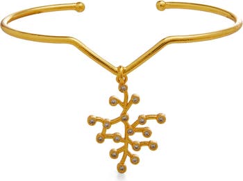 The Auro Bracelet is a handcrafted adjustable bracelet made from brass with 22k gold plating. Geometric forms are accented with white cubic zirconia for subtle sparkle. Lightweight and easy to wear, the bracelet fits comfortably on the wrist.