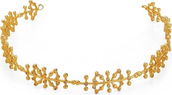 The Auro Choker is a handcrafted necklace made from 22k gold-plated brass with white cubic zirconia accents. Adjustable links allow for a comfortable fit, and the choker sits securely around the neck.