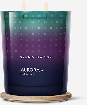 Sandalwood and juniper berries, jasmine and lime. A perfume and Swedish rapeseed wax blend in painted glass with a pure cotton wick and engraved beechwood lid. Packaging card from managed Nordic forests with water based colour dyes. 350g. Up to 50 hours. Magical, elusive, indefinable. The aurora borealis are one of nature’s seven wonders, a symphony of colour, movement and scale once thought by ancient Norse chroniclers to be sun flares, great ocean fires or glacial fluorescence.