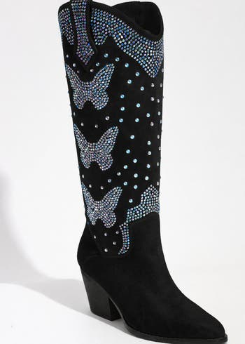 The Aurora Cowboy Boot brings a touch of playful, fairy-inspired sparkle to classic Western style. Designed with signature blue rhinestone butterflies on soft white faux suede, these boots add a dreamy, standout detail to a traditional silhouette.Perfect for the rodeo, festivals, or a night out, the Aurora Cowboy Boot blends statement style with authentic Western attitude. The crystal accents catch the light beautifully, pairing just as well with denim as they do with dresses.Slip them on and step out with confidence—cowboy style with a whimsical twist
