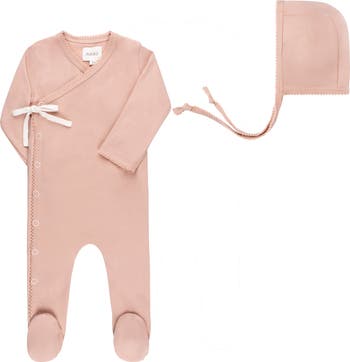 Introducing our Kimono Collection - Footie & Bonnet Set: the perfect blend of sweetness and comfort! Made with soft and stretchy ribbed cotton, with a scallop trim detail. Say goodbye to boring footies and hello to stylish comfort!