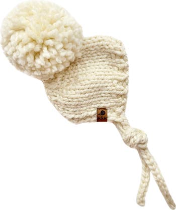 Keep baby cute and cozy in this chunky, pom-topped hat styled with soft straps for a comfortable fit.