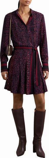 A color switch changes the look of the fierce print slithered across a lightweight shirtdress cinched with a contrast sash.