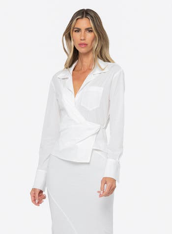The Aurora Top is a sleek wrap-style blouse with a sharp collar and soft V-neckline. Crafted in silky nylon, it features long sleeves with structured cuffs and a gently contoured waist for a polished, effortless finish.