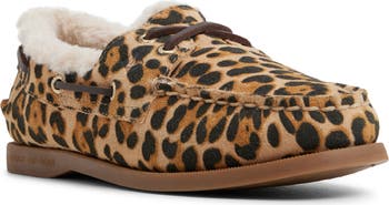 A 360° lacing system provides a custom fit on a weekend-ready boat shoe featuring raw-hide laces and a plush faux-fur lining that's warmed with lambswool.