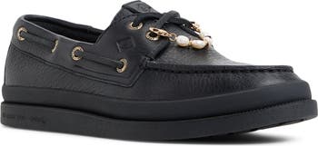 A rubberized mudguard that protects the premium leather offers a bold look, while a detachable faux-pearl embellishment adds a glam flourish to this updated boat shoe. A 360-degree Lacing System perfects the fit and Sperry's Wave-Siping™ enhances grip in wet or dry conditions.