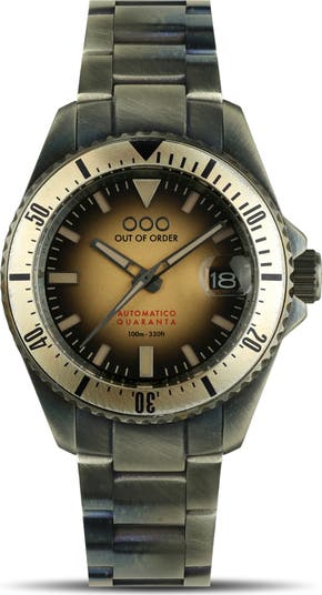 Sandblasted and sunburned stainless steel enhances the ruggedly reliable rep of this automatic bracelet watch with a look that evokes sand's relaxing and challenging associations in nature—from peaceful beaches to unrelenting deserts.
