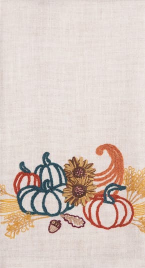 Celebrate the season with the Autumn Botanical Pumpkin Kitchen Towel, featuring a vibrant cornucopia overflowing with pumpkins and gourds in rich autumn hues, nestled on a bed of wheat. Classic sunflowers crown the design, creating a delightful tapestry of fall icons. This embroidered towel is perfect for adding a stylish and festive touch to any kitchen decor, capturing the essence of autumn in every detail.
