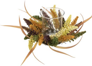 This fall harvest candle holder would be the perfect addition to your Thanksgiving decor. Adding warmth and pops of color with orange and purple dried flower stalks. Place a pillar candle inside to display on mantles or as a centerpiece. Product Features: Decorative glass candle holder Accented with orange, purple, yellow, and green flowering foliage Designed with a pillar glass candle holder Recommended for indoor use only Dimensions: 6"H x 18"W x 18"D (when fully fluffed, long leaves) Candleholders: 4" diameter (approximately) Material(s): glass/plastic/foam/polyester Note: Candles not included