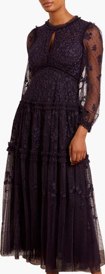 The Autumn Lace Long Sleeve Ankle Gown in signature Needle & Thread style is designed with floral motif embroidery inspired by antique lace designs. This gown is developed with romantic sheer long sleeves, and a gathered tiered hem, and is created from layers of soft tulle to create a flattering silhouette. A classic and contemporary style.