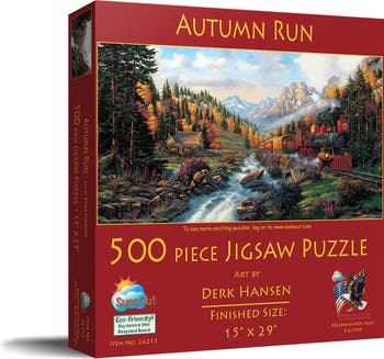 Experience the vibrant world of fall colors and immerse yourself in the tranquility of autumn with the SUNSOUT INC Autumn Run 500 piece jigsaw puzzle, designed by renowned artist Derk Hansen and crafted from high-quality recycled cardboard. Made in the USA using soy-based inks and premium board, SunsOut Puzzles offers eco-friendly and meticulously crafted products that blend the love of nature with the challenging art of puzzling. Arriving in a full-color display box, these durable and perfectly-fitting puzzles are testament to both quality and precision, ensuring hours of mindful relaxation and contentment for adults. The company also champions sustainability and supports creative arts, embodying a proud, woman-owned small business. Committed to providing exceptional customer service, SunsOut Puzzles guarantees a flawless from start to finish, with a dedicated team ready to assist with any missing or damaged pieces. Whether you're gifting this elegant puzzle or embarking on a creative journey yourself, you'll surely fall in love with the autumn splendor.
