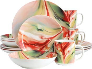 The Elama Autumn Storm 16-Piece Porcelain Dinnerware Set brings the rich, warm hues of fall to your table with its stunning design and durable construction. Featuring a beautiful blend of red, orange, and green tones, the set showcases an abstract pattern that evokes the vibrant colors of autumn, making it perfect for both everyday dining and festive gatherings. The round shape of each piece adds a classic touch, while the bold, earthy colors create an inviting and cozy atmosphere. Made from high-quality porcelain, this dinnerware set is designed for long-lasting beauty and strength, ideal for both casual and special occasions.This 16-piece set includes everything you need to serve four people, making it perfect for family meals or entertaining guests. It features four 10.5" dinner plates for main courses, four 8" salad plates for appetizers or side dishes, four 8" soup bowls ideal for soups, salads, and stews, and four 13 oz. mugs to enjoy your favorite hot drinks. Each piece is crafted with attention to detail, ensuring that it will impress your guests while providing the practicality you need for everyday use.The Elama Autumn Storm dinnerware set is designed for ease of use. It is dishwasher safe, making cleanup a breeze, and microwave safe, allowing you to easily reheat meals and beverages. Whether you're hosting a dinner party, enjoying a holiday feast, or simply adding a touch of autumn to your daily routine, this set will add warmth and beauty to your dining table. Combining elegance, functionality, and durability, the Elama Autumn Storm 16-Piece Porcelain Dinnerware Set is the perfect way to enhance your dining experience with the cozy charm of autumn.