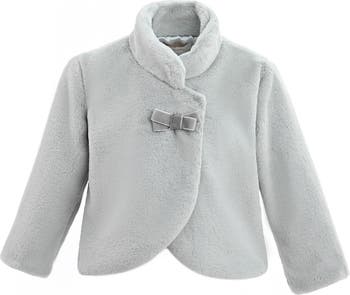 A warm, plush coat for a child featuring a high rounded collar and an elegant asymmetrical front closure; the soft faux‑fur texture and subtle bow detail create a cozy yet stylish outerwear piece for cooler seasons.