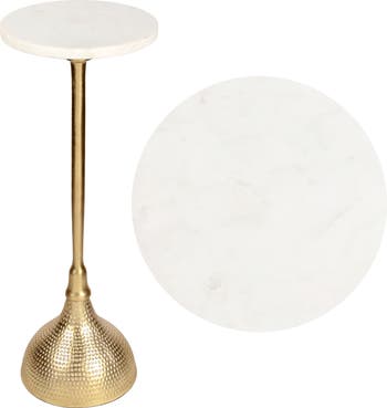 This pedestal accent table showcases a refined mix of materials with a smooth marble top and a hammered metal base. The slender profile and artistic detailing bring elegance and versatility to a wide range of interiors. Perfect for holding beverages, displaying décor, or serving as a stylish accent, this piece combines durability with timeless appeal.