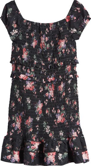 Smocking lends on-trend style to a kid-sized dress patterned by vibrant blooms for added charm.