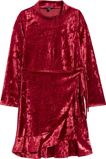 Made from lustrous crushed velvet with a ruffled hem, this picture-perfect faux-wrap dress is a modern silhouette your kid will adore.