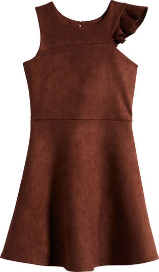 Your child will sweeten the occasion in this scuba-knit dress styled with a swingy skirt and a contemporary, ruffled one-shoulder neck.