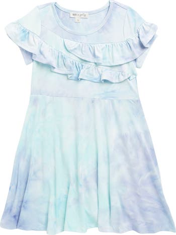 A frilly ruffled trim details the neckline of this short sleeved dress.