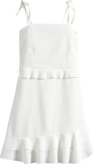 A rich texture distinguishes the airy knit of this tiered dress suspended by tied straps to give a trendy flourish to their warm-weather look.