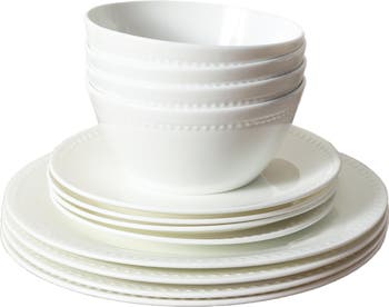 Ava Bone china Dinnerware Set with embossed dots comes with complete place settings. This classic set of bone china tableware includes large round 10.5" dinner plates, classy round 8" salad plates, deep 6" round bowls and 13 oz. mugs. Reminiscent of royal sets of china, these home essentials are expertly crafted and artfully designed. 100% dishwasher and microwave safe for easy cleaning and durability. The elegant dot detailing borders each dish in this exemplary set. These pieces go great in either a formal or casual setting. Lay out your favorite tablecloth, cutlery and stemware, and let the dishes set do the rest. Makes every occasion memorable with unforgettable dinnerware.