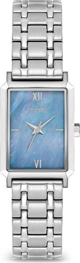 Roman numerals punctuate the mother-of-pearl dial of this modern bracelet watch featuring a hexagonal case and slim bracelet strap.