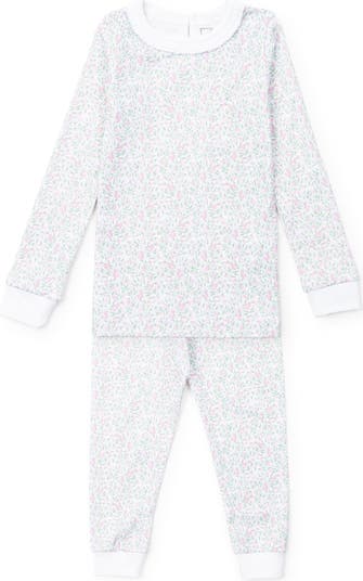 Pima cotton long sleeved pajama top and pant set. Pants have an elastic waistband, and the long-sleeved top has a small, ruffled detail around neck and button closure in the back. Made from 100% Peruvian Cotton. For child's safety, garment should fit snugly. This garment is not flame resistant. Loose fitting clothing is more likely to catch fire.
