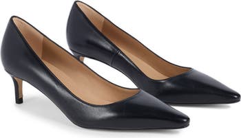 A snip toe furthers the streamlined aesthetic of a rich leather pump set on a svelte kitten heel for a whisper of height.