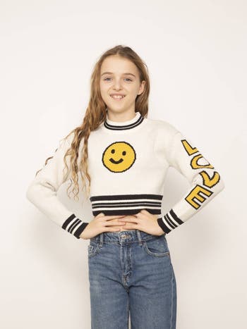 Spread love and positivity with our Ava Love Smile Crew. The smiley face design and "love" text on the sleeve are sure to brighten up your day. Stay cozy and stylish with this crew neck top.