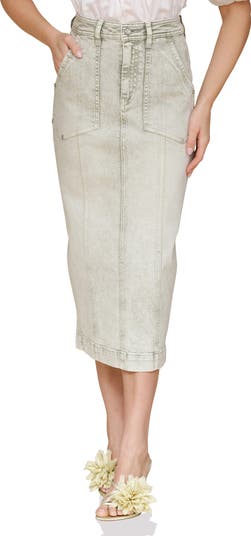 An irresistible jean skirt is updated in a longer length and made with a back vent for easy movement.