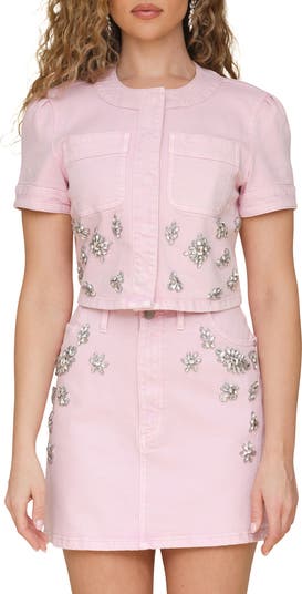Glam up your day with this retro short-sleeve denim shirt splashed with sparkly rhinestone clusters against a pretty pink background.