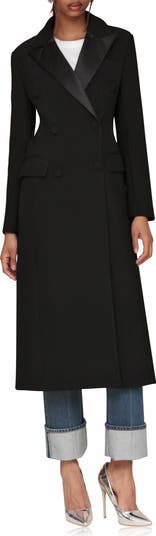 Tuxedo-inspired satin lapels lend a glamorous element to this double-breasted coat tailored in a sculptured hourglass silhouette from a stretch-enhanced knit.