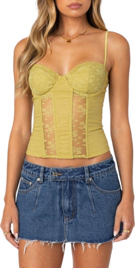 Sheer lace panels add a romantic touch to this corset-inspired top made from lightweight linen and cotton.
