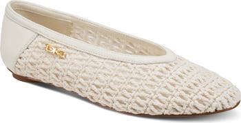 Glinting logo hardware adds a signature flourish to the mixed-media upper of a streamlined ballet flat grounded by a grippy sole for traction and stability.