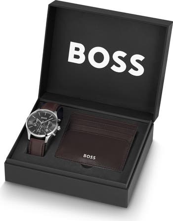 A double dose of timeless elegance, this watch and wallet duo perfectly complement each other in rich chocolate-brown leather. The robust chronograph features a bezel-framed date window and heavy-duty stainless steel case.