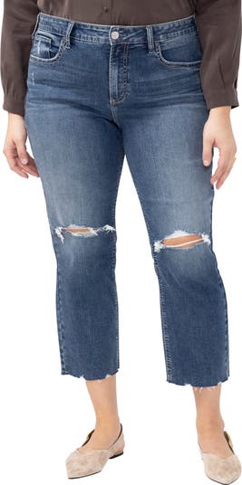With a contoured waistband and extra room in the hips and thighs, these stretchy, ripped straight-leg jeans are all about that curve-flattering fit.