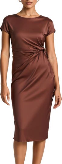 The Area Stars Avery Draped Satin Dress delivers elevated elegance with its glossy satin fabrication, gathered side waist detail, and cap sleeves that polish the silhouette. Featuring a round neck and pullover style with a button at the back neck, it skims the body for a flattering mid‑calf length that suits both day and evening occasions. Perfect with heels or sandals, it’s an effortless choice for weddings, dinners, or special events.