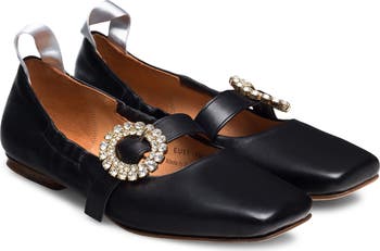 Sparkling hardware accentuates the mary jane strap of a square-toe flat fashioned from rich Italian leather.