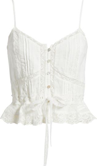 Delicate lace insets breathe romance into this corset-influenced cotton crop top with a flouncy peplum hem.
