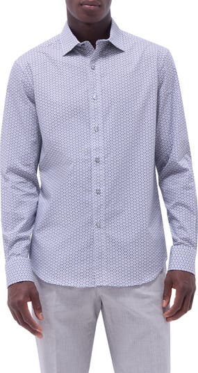 A mesmerizing geometric print adds refined style to a stretch-cotton sport shirt cut for a modern, shaped fit that looks good tucked or untucked.