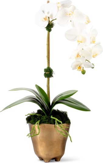 The Axel RealTouch Orchid Arrangement features a stunning RealTouch Orchid, gracefully displayed in an elegant gold-legged vase, complemented by rattan sticks and an Orchid leaf. A luxurious addition to any home, this sophisticated piece makes a perfect gift, embodying timeless beauty and refinement. A lasting luxury, timeless and unrivaled.