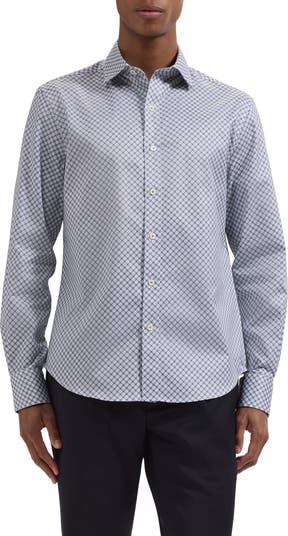 Crisp cotton offers breathable comfort in this trim button-up shirt with a curved hem that looks smart tucked or untucked. Thoughtful touches like mother‑of‑pearl buttons and mitered cuffs that convert to accommodate cuff links complete the polished look.