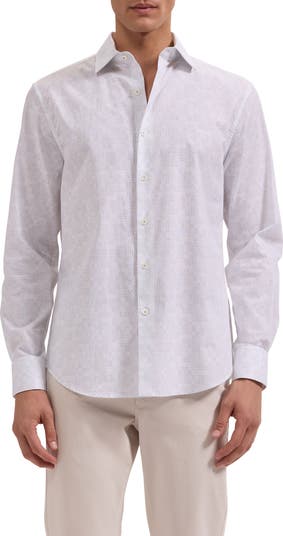 Crisp cotton offers breathable comfort in this trim button-up shirt with a curved hem that looks smart tucked or untucked. Thoughtful touches like mother‑of‑pearl buttons and mitered cuffs that convert to accommodate cuff links complete the polished look.
