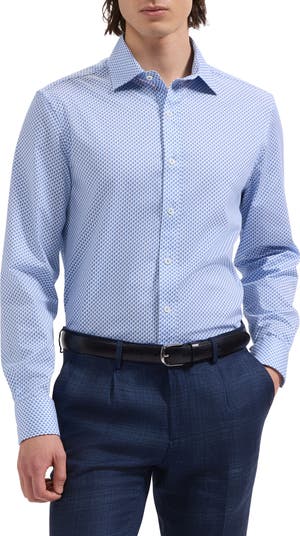 Crisp cotton offers breathable comfort in this trim button-up shirt with a curved hem that looks smart tucked or untucked. Thoughtful touches like mother‑of‑pearl buttons and mitered cuffs that convert to accommodate cuff links complete the polished look.