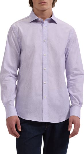 A mesmerizing geometric print adds refined style to a stretch-cotton sport shirt cut for a modern, shaped fit that looks good tucked or untucked.