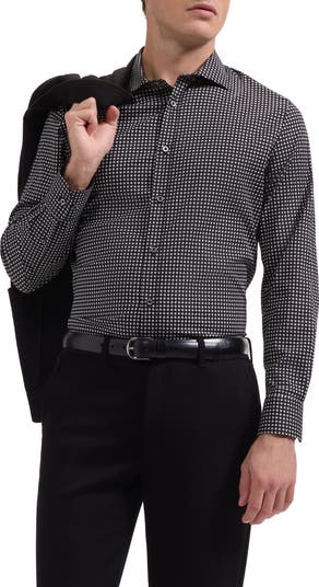 Crisp stretch cotton offers breathable comfort in this trim button-up shirt with a curved hem that looks smart tucked or untucked. Thoughtful touches like mother‑of‑pearl buttons and mitered cuffs that convert to accommodate cuff links complete the polished look.