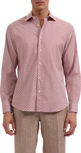 Crisp stretch cotton offers breathable comfort in this trim button-up shirt with a curved hem that looks smart tucked or untucked. Thoughtful touches like mother‑of‑pearl buttons and mitered cuffs that convert to accommodate cuff links complete the polished look.