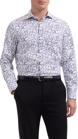 An abstract print details a refined button-up shirt made from stretchy, breathable cotton for a flexible fit.