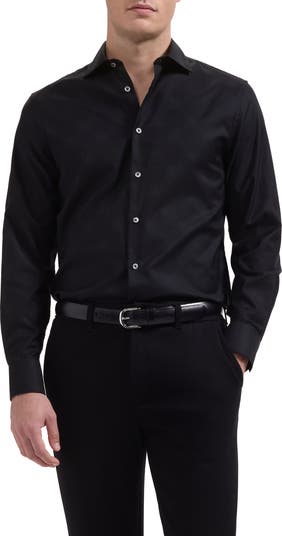 Crisp stretch cotton offers breathable comfort in this trim button-up shirt with a curved hem that looks smart tucked or untucked. Thoughtful touches like mother‑of‑pearl buttons and mitered cuffs that convert to accommodate cuff links complete the polished look.