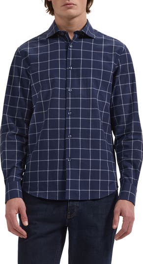 A classic windowpane check gives an polished touch to a crisp button-up shirt enhanced with comfortable stretch.