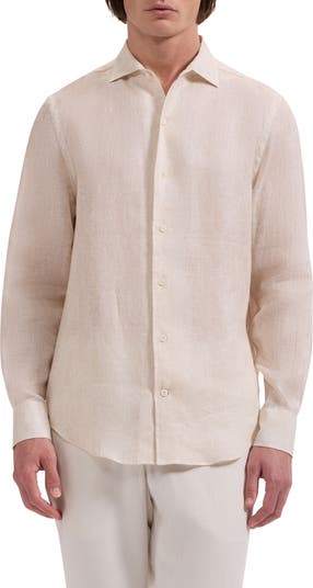 Subtly patterned linen makes a sunny-weather favorite of a shirt that features minimal detailing and a curved hem that works tucked or untucked. The pointed collar and traditional tailoring keep you looking smart even when you don't have to.